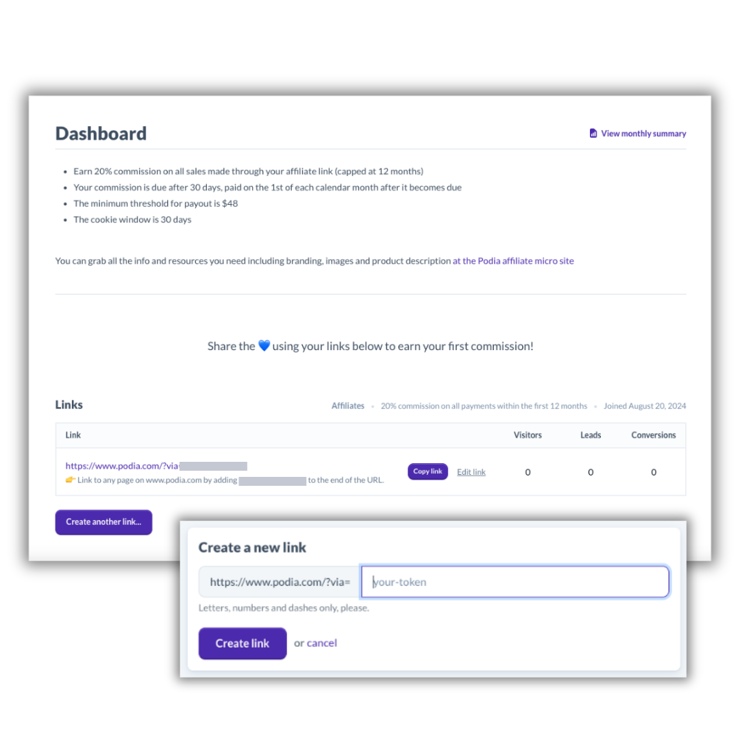 Hey Podia affiliates! On this site, you can find swipe copy, screenshots, and FAQs about the Podia affiliate program. As an affiliate, you can earn a 20% commission on each sale made through your link.